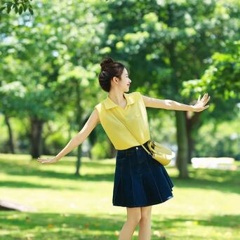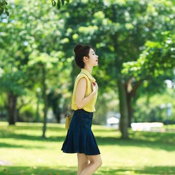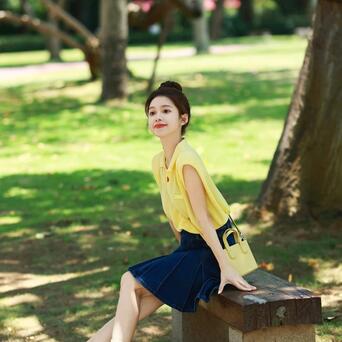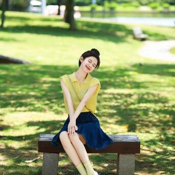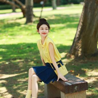 下身搭配蓝色牛仔百褶短裙,经典牛仔蓝与活力黄的碰撞,擦出青春的火花。百褶裙摆随风轻舞,每一步都散发着灵动与甜美。👗